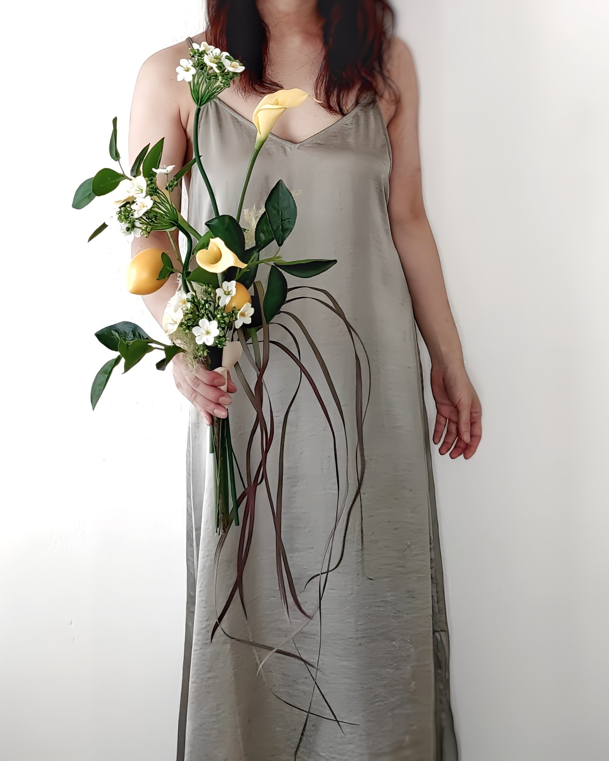 ハイグレードのアーティフィシャルフラワーからさらに、質感など本物に見えるお花や葉を厳選しブーケを束ねています。