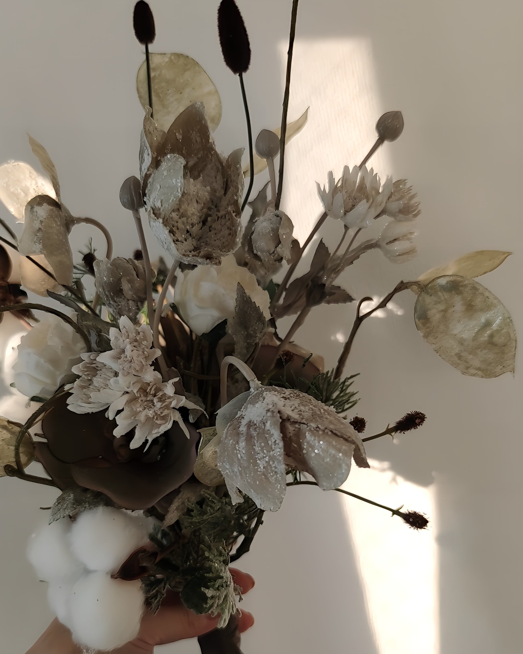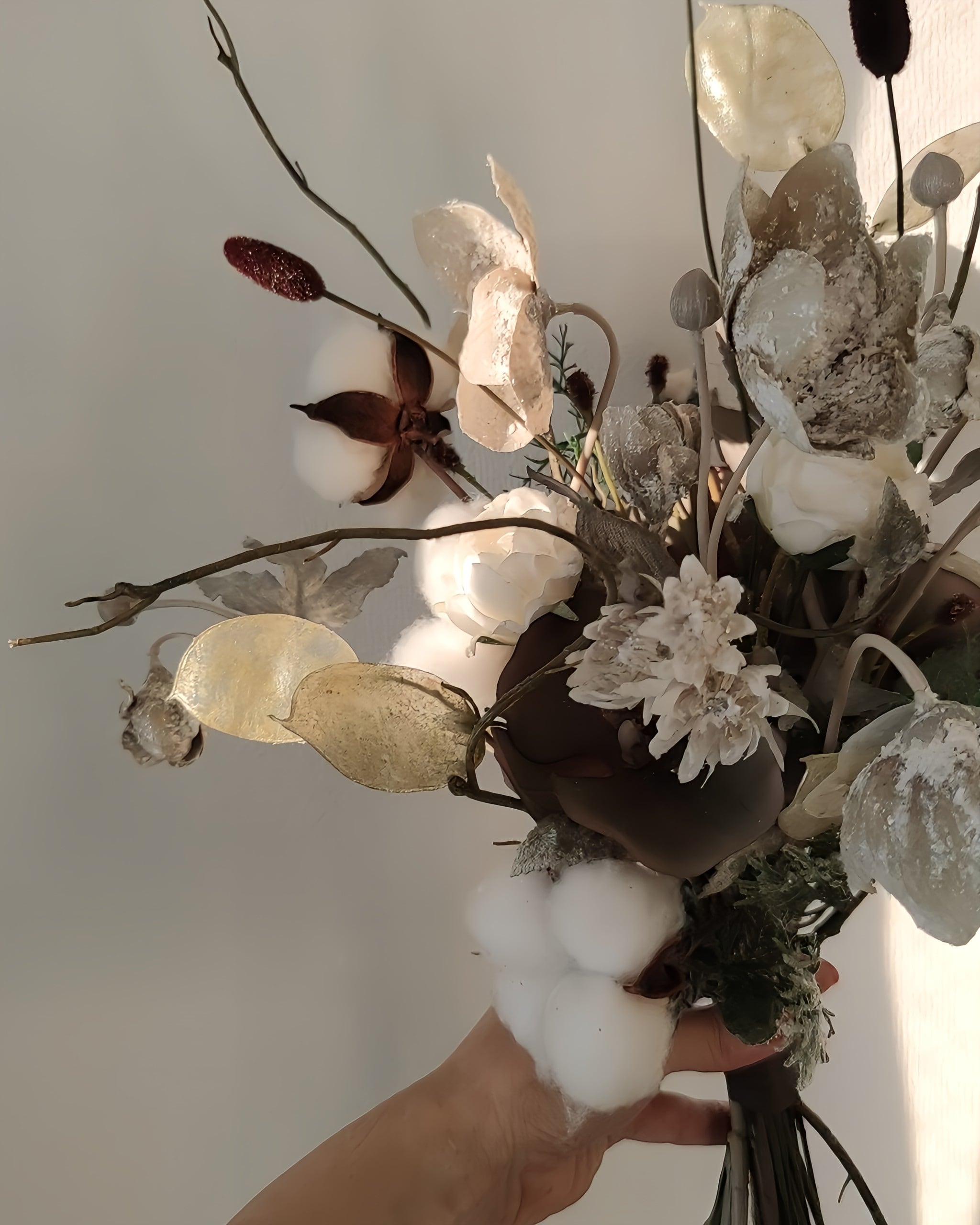 ハイグレードのアーティフィシャルフラワーからさらに、質感など本物に見えるお花や葉を厳選しブーケを束ねています。